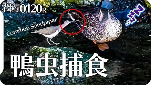 0120R【カルガモつつく鳥】捕食イソシギ。プチトマトくわえたヒヨドリ。ジョウビタキのオスメス。シジュウカラ水浴びとメジロ鳴き声。P1000 #身近な生き物語 #イソシギ #バードウォッチング 鶴見川水系恩田川の野鳥達 イソシギが寝ているカルガモから虫を捕…